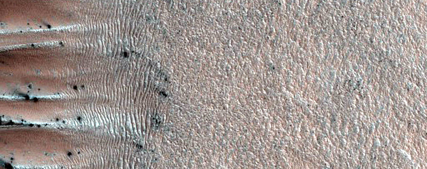 | Acquisition date 05 March 2025 Local Mars time 13:54 Latitude (centered) 80.864° Longitude (East) 279.825° Spacecraft altitude 318.0 km (197.7 miles) Original image scale range from 31.9 cm/pixel (with 1 x 1 binning) to 63.8 cm/pixel (with 2 x 2 binning) Map projected scale 25 cm/pixel Map projection Polarstereographic Emission angle 2.2° Phase angle 64.0° Solar incidence angle 62°, with the Sun about 28° above the horizon Solar longitude 52.7°, Northern Spring For non-map projected images North azimuth: 109° Sub-solar azimuth: 318.4° | JPEG Black and white map projected non-map IRB color map projected non-map Merged IRB map projected Merged RGB map projected RGB color non-map projected JP2 Black and white map-projected (796MB) IRB color map-projected (538MB) JP2 EXTRAS Black and white map-projected (397MB) non-map (479MB) IRB color map projected (205MB) non-map (323MB) Merged IRB map projected (230MB) Merged RGB map-projected (212MB) RGB color non map (289MB) |
