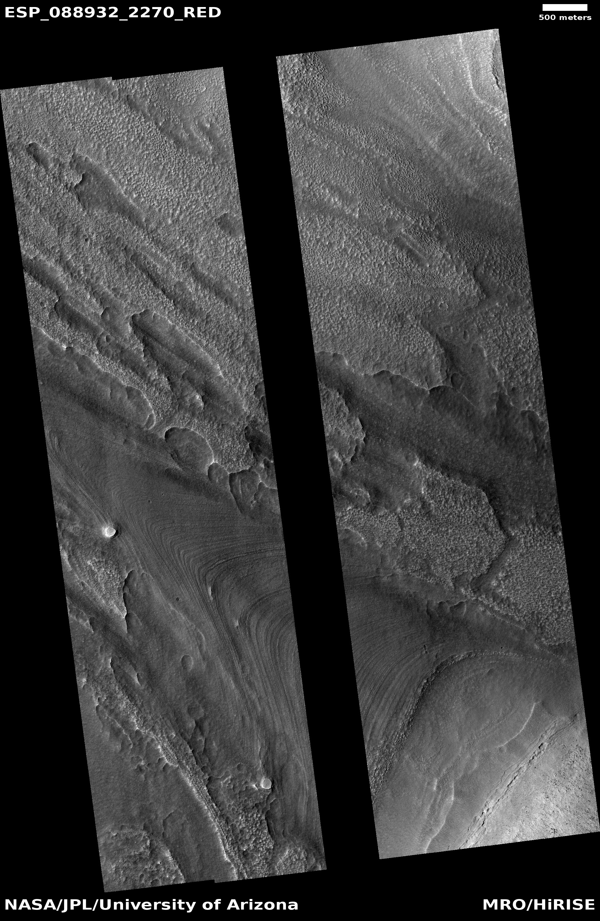 Acquisition date 16 July 2025 Local Mars time 15:18 Latitude (centered) 46.446° Longitude (East) 49.889° Spacecraft altitude 299.7 km (186.3 miles) Original image scale range from 30.0 cm/pixel (with 1 x 1 binning) to 60.1 cm/pixel (with 2 x 2 binning) Map projected scale 25 cm/pixel and North is up Map projection Equirectangular Emission angle 2.9° Phase angle 48.8° Solar incidence angle 46°, with the Sun about 44° above the horizon Solar longitude 111.5°, Northern Summer For non-map projected images North azimuth: 97° Sub-solar azimuth: 353.2° | JPEG Black and white map projected non-map IRB color map projected non-map Merged IRB map projected Merged RGB map projected RGB color non-map projected JP2 Black and white map-projected (404MB) IRB color map-projected (173MB) JP2 EXTRAS Black and white map-projected (192MB) non-map (270MB) IRB color map projected (65MB) non-map (119MB) Merged IRB map projected (134MB) Merged RGB map-projected (131MB) RGB color non map (193MB) | ANAGLYPHS Map-projected, reduced-resolution Full resolution JP2 download Anaglyph details page ADDITIONAL INFORMATION B&W label Color label Merged IRB label Merged RGB label EDR products HiView NB IRB: infrared-red-blue RGB: red-green-blue About color products (PDF) Black & white is 5 km across; enhanced color about 1 km For scale, use JPEG/JP2 black & white map-projected images USAGE POLICY All of the images produced by HiRISE and accessible on this site are within the public domain: there are no restrictions on their usage by anyone in the public, including news or science organizations. We do ask for a credit line where possible: NASA/JPL-Caltech/UArizona POSTSCRIPT NASA’s Jet Propulsion Laboratory, a division of the California Institute of Technology in Pasadena, Calif., manages the Mars Reconnaissance Orbiter for NASA’s Science Mission Directorate, Washington. The HiRISE camera was built by Ball Aerospace and Technology Corporation and is operated by the University of Arizona. |