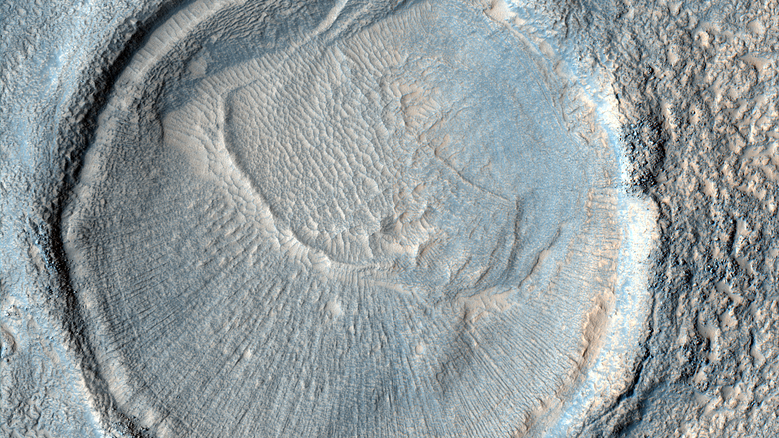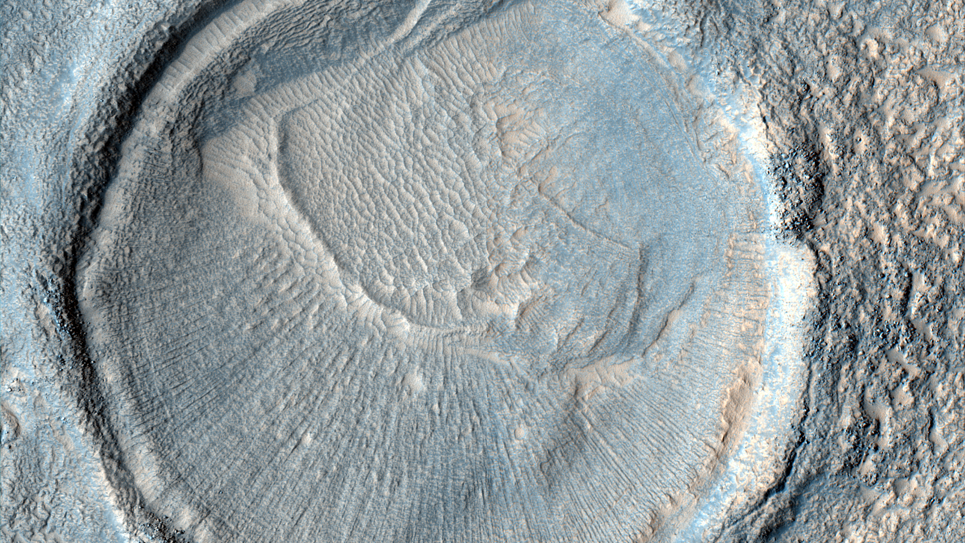 | Acquisition date 16 August 2025 Local Mars time 15:24 Latitude (centered) 37.684° Longitude (East) 175.896° Spacecraft altitude 300.3 km (186.6 miles) Original image scale range 60.3 cm/pixel (with 2 x 2 binning) so objects ~181 cm across are resolved Map projected scale 50 cm/pixel and North is up Map projection Equirectangular Emission angle 5.7° Phase angle 53.1° Solar incidence angle 47°, with the Sun about 43° above the horizon Solar longitude 125.7°, Northern Summer For non-map projected images North azimuth: 97° Sub-solar azimuth: 359.5° | JPEG Black and white map projected non-map IRB color map projected non-map Merged IRB map projected Merged RGB map projected RGB color non-map projected JP2 Black and white map-projected (148MB) IRB color map-projected (51MB) JP2 EXTRAS Black and white map-projected (66MB) non-map (85MB) IRB color map projected (16MB) non-map (39MB) Merged IRB map projected (148MB) Merged RGB map-projected (142MB) RGB color non map (75MB) | ANAGLYPHS Map-projected, reduced-resolution Full resolution JP2 download Anaglyph details page ADDITIONAL INFORMATION B&W label Color label Merged IRB label Merged RGB label EDR products HiView NB IRB: infrared-red-blue RGB: red-green-blue About color products (PDF) Black & white is 5 km across; enhanced color about 1 km For scale, use JPEG/JP2 black & white map-projected images USAGE POLICY All of the images produced by HiRISE and accessible on this site are within the public domain: there are no restrictions on their usage by anyone in the public, including news or science organizations. We do ask for a credit line where possible: NASA/JPL-Caltech/UArizona POSTSCRIPT NASA’s Jet Propulsion Laboratory, a division of the California Institute of Technology in Pasadena, Calif., manages the Mars Reconnaissance Orbiter for NASA’s Science Mission Directorate, Washington. The HiRISE camera was built by Ball Aerospace and Technology Corporation and is operated by the University of Arizona. |