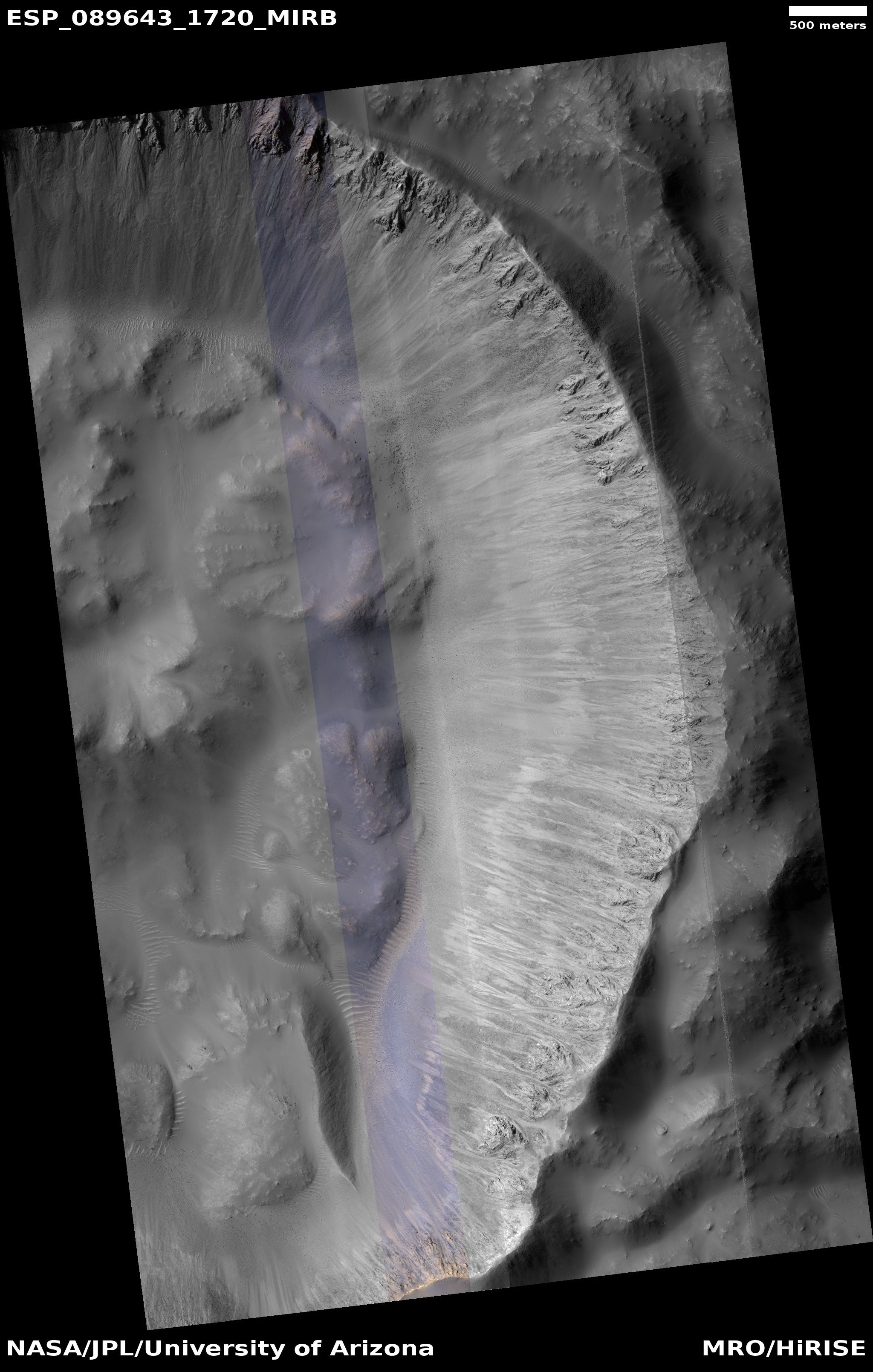 ADDITIONAL INFORMATION B&W label Color label Merged IRB label Merged RGB label EDR products HiView NB IRB: infrared-red-blue RGB: red-green-blue About color products (PDF) Black & white is 5 km across; enhanced color about 1 km For scale, use JPEG/JP2 black & white map-projected images USAGE POLICY All of the images produced by HiRISE and accessible on this site are within the public domain: there are no restrictions on their usage by anyone in the public, including news or science organizations. We do ask for a credit line where possible: NASA/JPL-Caltech/UArizona POSTSCRIPT NASA’s Jet Propulsion Laboratory, a division of the California Institute of Technology in Pasadena, Calif., manages the Mars Reconnaissance Orbiter for NASA’s Science Mission Directorate, Washington. The HiRISE camera was built by Ball Aerospace and Technology Corporation and is operated by the University of Arizona. |