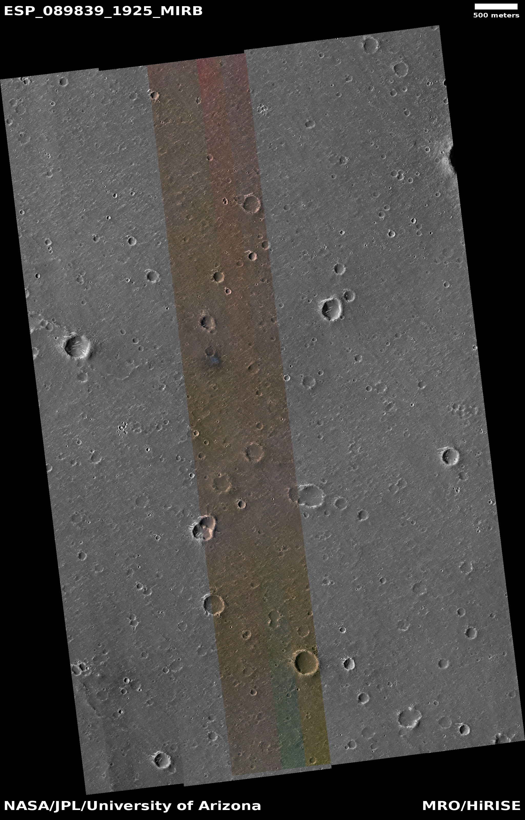 ADDITIONAL INFORMATION B&W label Color label Merged IRB label Merged RGB label EDR products HiView NB IRB: infrared-red-blue RGB: red-green-blue About color products (PDF) Black & white is 5 km across; enhanced color about 1 km For scale, use JPEG/JP2 black & white map-projected images USAGE POLICY All of the images produced by HiRISE and accessible on this site are within the public domain: there are no restrictions on their usage by anyone in the public, including news or science organizations. We do ask for a credit line where possible: NASA/JPL-Caltech/UArizona POSTSCRIPT NASA’s Jet Propulsion Laboratory, a division of the California Institute of Technology in Pasadena, Calif., manages the Mars Reconnaissance Orbiter for NASA’s Science Mission Directorate, Washington. The HiRISE camera was built by Ball Aerospace and Technology Corporation and is operated by the University of Arizona. |