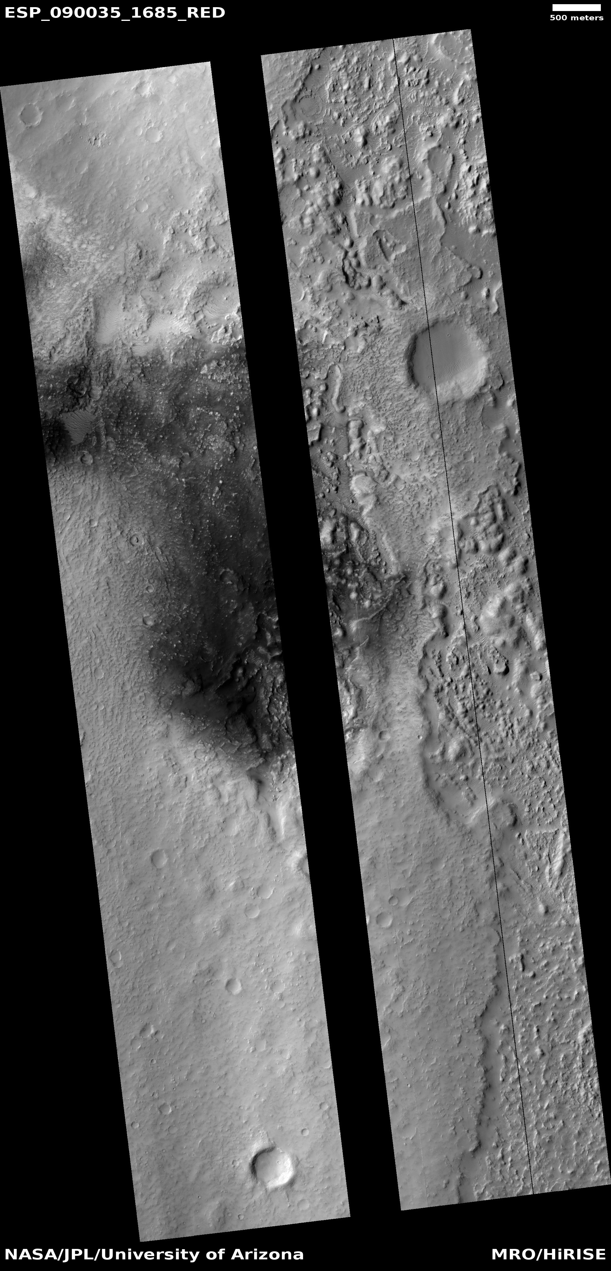 | Acquisition date 10 October 2025 Local Mars time 15:47 Latitude (centered) -11.205° Longitude (East) 185.821° Spacecraft altitude 264.8 km (164.6 miles) Original image scale range 53.6 cm/pixel (with 2 x 2 binning) so objects ~161 cm across are resolved Map projected scale 50 cm/pixel and North is up Map projection Equirectangular Emission angle 8.6° Phase angle 53.2° Solar incidence angle 61°, with the Sun about 29° above the horizon Solar longitude 153.2°, Northern Summer For non-map projected images North azimuth: 97° Sub-solar azimuth: 26.2° | JPEG Black and white map projected non-map IRB color map projected non-map Merged IRB map projected Merged RGB map projected RGB color non-map projected JP2 Black and white map-projected (140MB) IRB color map-projected (48MB) JP2 EXTRAS Black and white map-projected (76MB) non-map (127MB) IRB color map projected (18MB) non-map (47MB) Merged IRB map projected (133MB) Merged RGB map-projected (126MB) RGB color non map (90MB) |