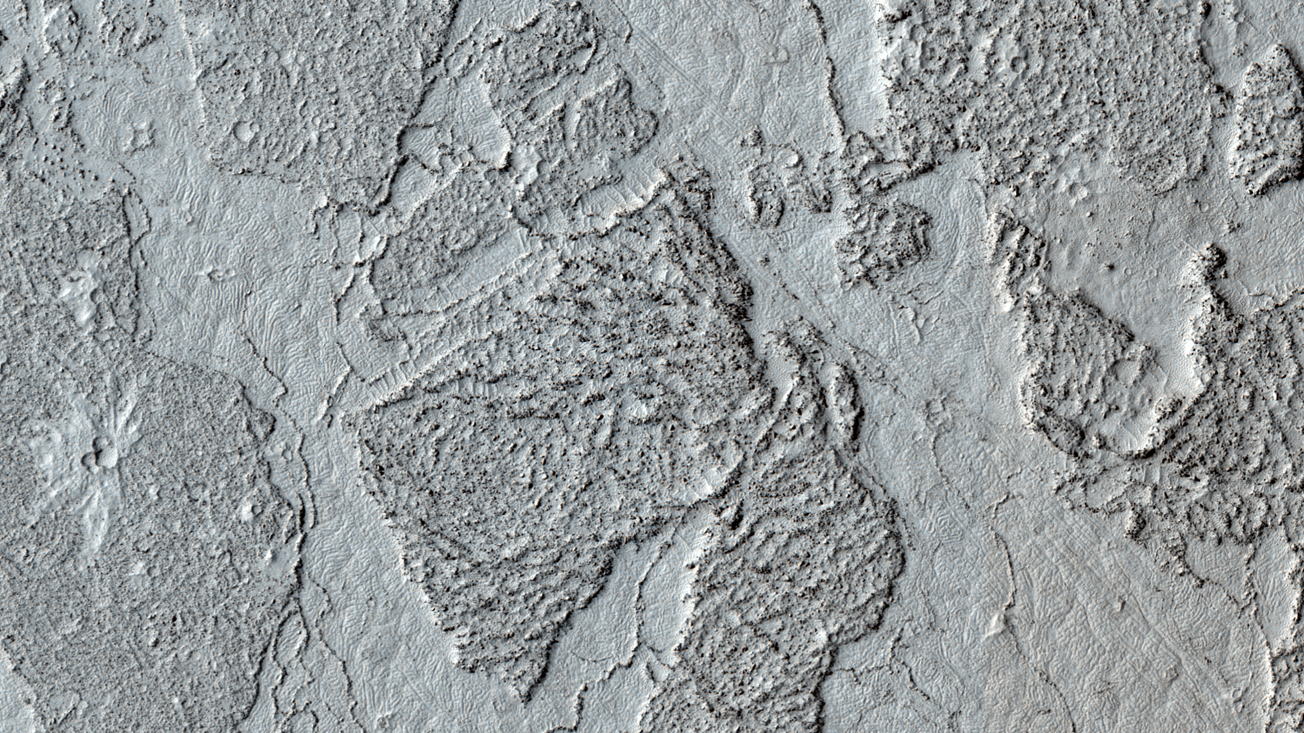 | Acquisition date 22 October 2025 Local Mars time 15:41 Latitude (centered) 7.656° Longitude (East) 156.834° Spacecraft altitude 277.0 km (172.1 miles) Original image scale range 55.8 cm/pixel (with 2 x 2 binning) so objects ~167 cm across are resolved Map projected scale 50 cm/pixel and North is up Map projection Equirectangular Emission angle 6.9° Phase angle 61.5° Solar incidence angle 55°, with the Sun about 35° above the horizon Solar longitude 159.1°, Northern Summer For non-map projected images North azimuth: 97° Sub-solar azimuth: 11.7° | JPEG Black and white map projected non-map IRB color map projected non-map Merged IRB map projected Merged RGB map projected RGB color non-map projected JP2 Black and white map-projected (195MB) IRB color map-projected (112MB) JP2 EXTRAS Black and white map-projected (75MB) non-map (113MB) IRB color map projected (28MB) non-map (104MB) Merged IRB map projected (204MB) Merged RGB map-projected (192MB) RGB color non map (99MB) | BONUS 4K (TIFF) 8K (TIFF) 10K (TIFF) ADDITIONAL INFORMATION B&W label Color label Merged IRB label Merged RGB label EDR products HiView NB IRB: infrared-red-blue RGB: red-green-blue About color products (PDF) Black & white is 5 km across; enhanced color about 1 km For scale, use JPEG/JP2 black & white map-projected images USAGE POLICY All of the images produced by HiRISE and accessible on this site are within the public domain: there are no restrictions on their usage by anyone in the public, including news or science organizations. We do ask for a credit line where possible: NASA/JPL-Caltech/UArizona POSTSCRIPT NASA’s Jet Propulsion Laboratory, a division of the California Institute of Technology in Pasadena, Calif., manages the Mars Reconnaissance Orbiter for NASA’s Science Mission Directorate, Washington. The HiRISE camera was built by Ball Aerospace and Technology Corporation and is operated by the University of Arizona. |
