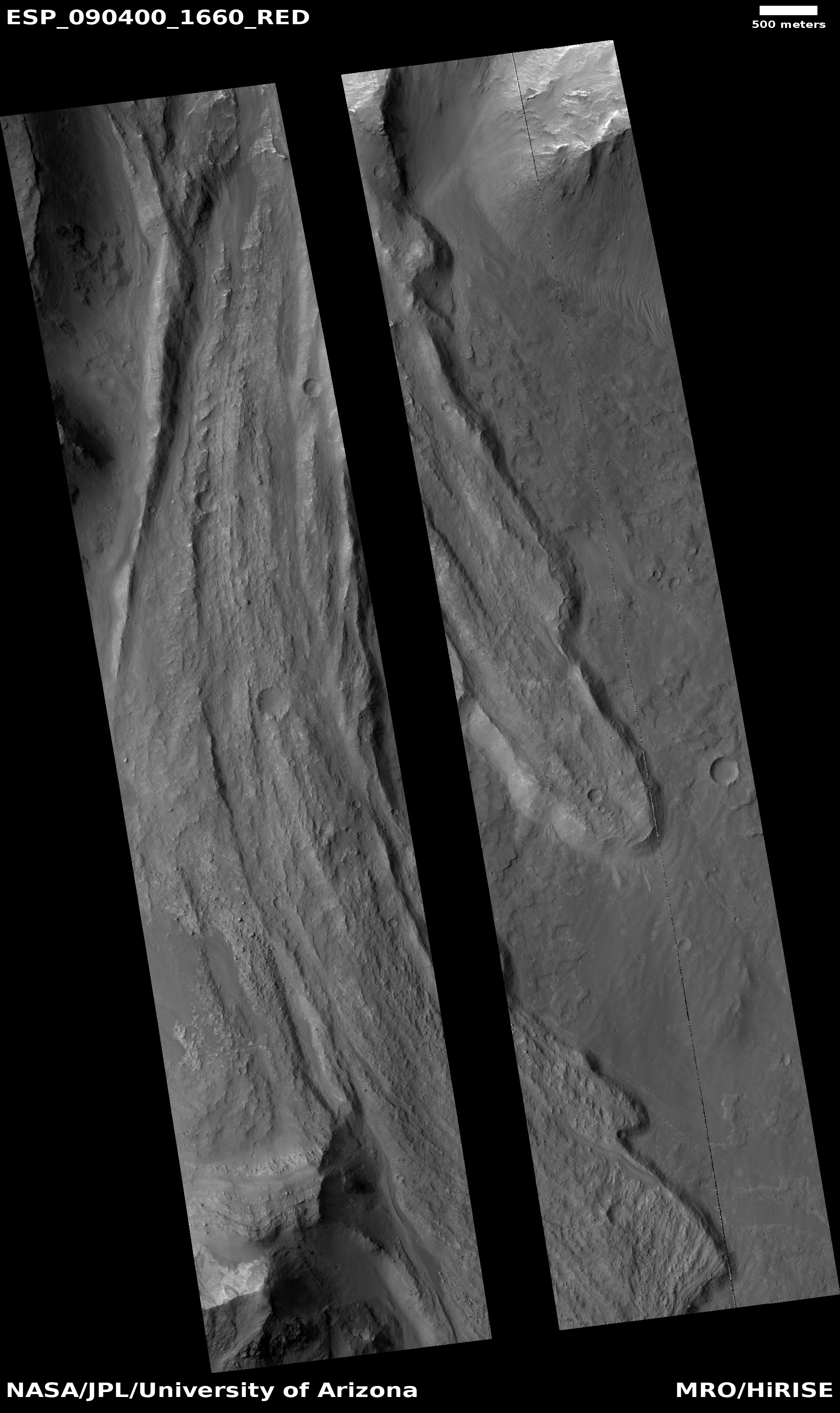 | Acquisition date 08 November 2025 Local Mars time 15:55 Latitude (centered) -13.747° Longitude (East) 303.375° Spacecraft altitude 265.2 km (164.8 miles) Original image scale range 55.1 cm/pixel (with 2 x 2 binning) so objects ~165 cm across are resolved Map projected scale 50 cm/pixel and North is up Map projection Equirectangular Emission angle 18.0° Phase angle 44.7° Solar incidence angle 61°, with the Sun about 29° above the horizon Solar longitude 168.3°, Northern Summer For non-map projected images North azimuth: 97° Sub-solar azimuth: 21.6° | JPEG Black and white map projected non-map IRB color map projected non-map Merged IRB map projected Merged RGB map projected RGB color non-map projected JP2 Black and white map-projected (143MB) IRB color map-projected (53MB) JP2 EXTRAS Black and white map-projected (79MB) non-map (113MB) IRB color map projected (27MB) non-map (48MB) Merged IRB map projected (146MB) Merged RGB map-projected (136MB) RGB color non map (90MB) | ANAGLYPHS Map-projected, reduced-resolution Full resolution JP2 download Anaglyph details page ADDITIONAL INFORMATION B&W label Color label Merged IRB label Merged RGB label EDR products HiView NB IRB: infrared-red-blue RGB: red-green-blue About color products (PDF) Black & white is 5 km across; enhanced color about 1 km For scale, use JPEG/JP2 black & white map-projected images USAGE POLICY All of the images produced by HiRISE and accessible on this site are within the public domain: there are no restrictions on their usage by anyone in the public, including news or science organizations. We do ask for a credit line where possible: NASA/JPL-Caltech/UArizona POSTSCRIPT NASA’s Jet Propulsion Laboratory, a division of the California Institute of Technology in Pasadena, Calif., manages the Mars Reconnaissance Orbiter for NASA’s Science Mission Directorate, Washington. The HiRISE camera was built by Ball Aerospace and Technology Corporation and is operated by the University of Arizona. |