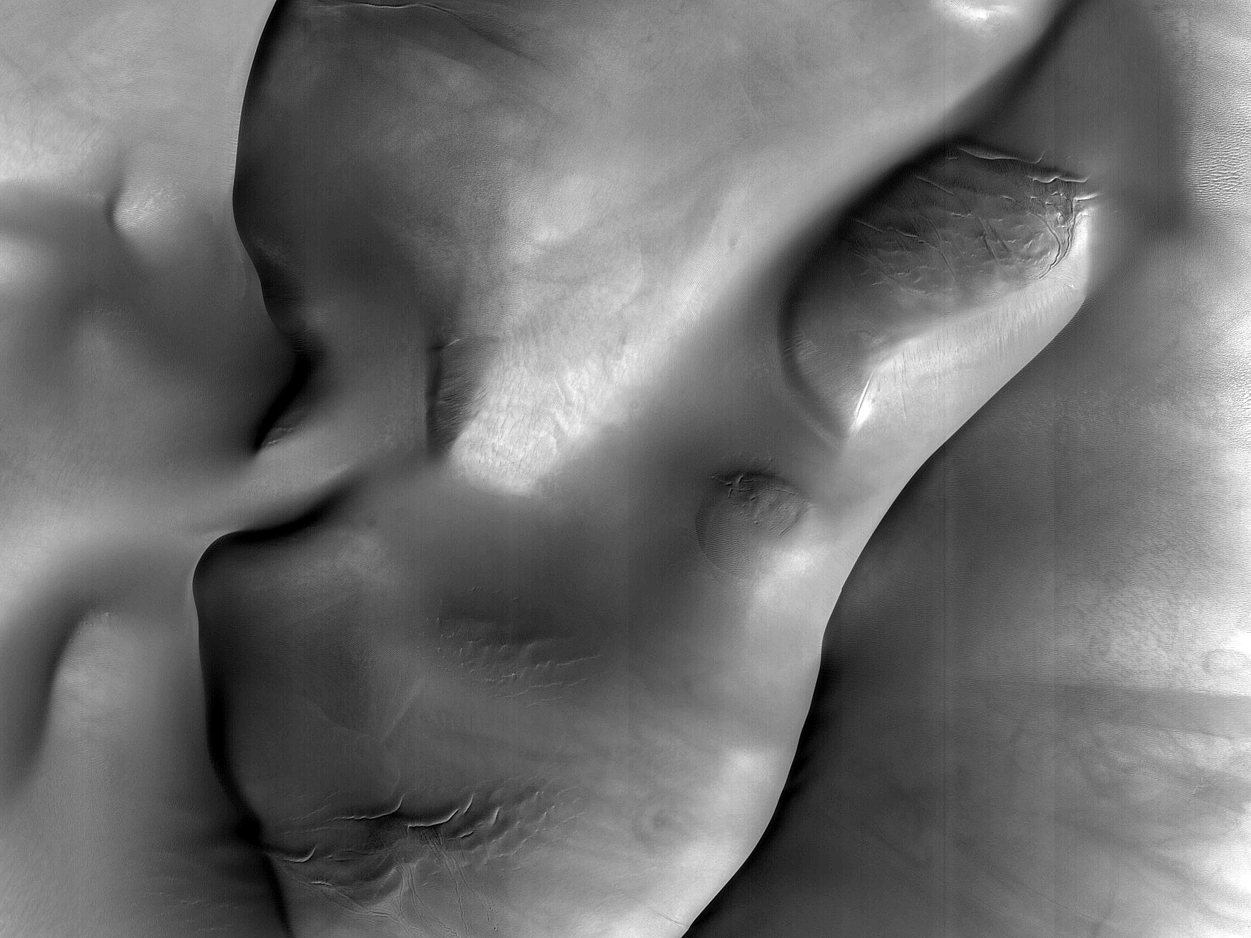 This overlaps with a previous image we obtained in 2009 and we have also taken six additional images to monitor gully formation. We want to see how any dune ripples have moved since then: have they erased the newly-formed gullies? Are we seeing a competition between wind, ice, and water here?