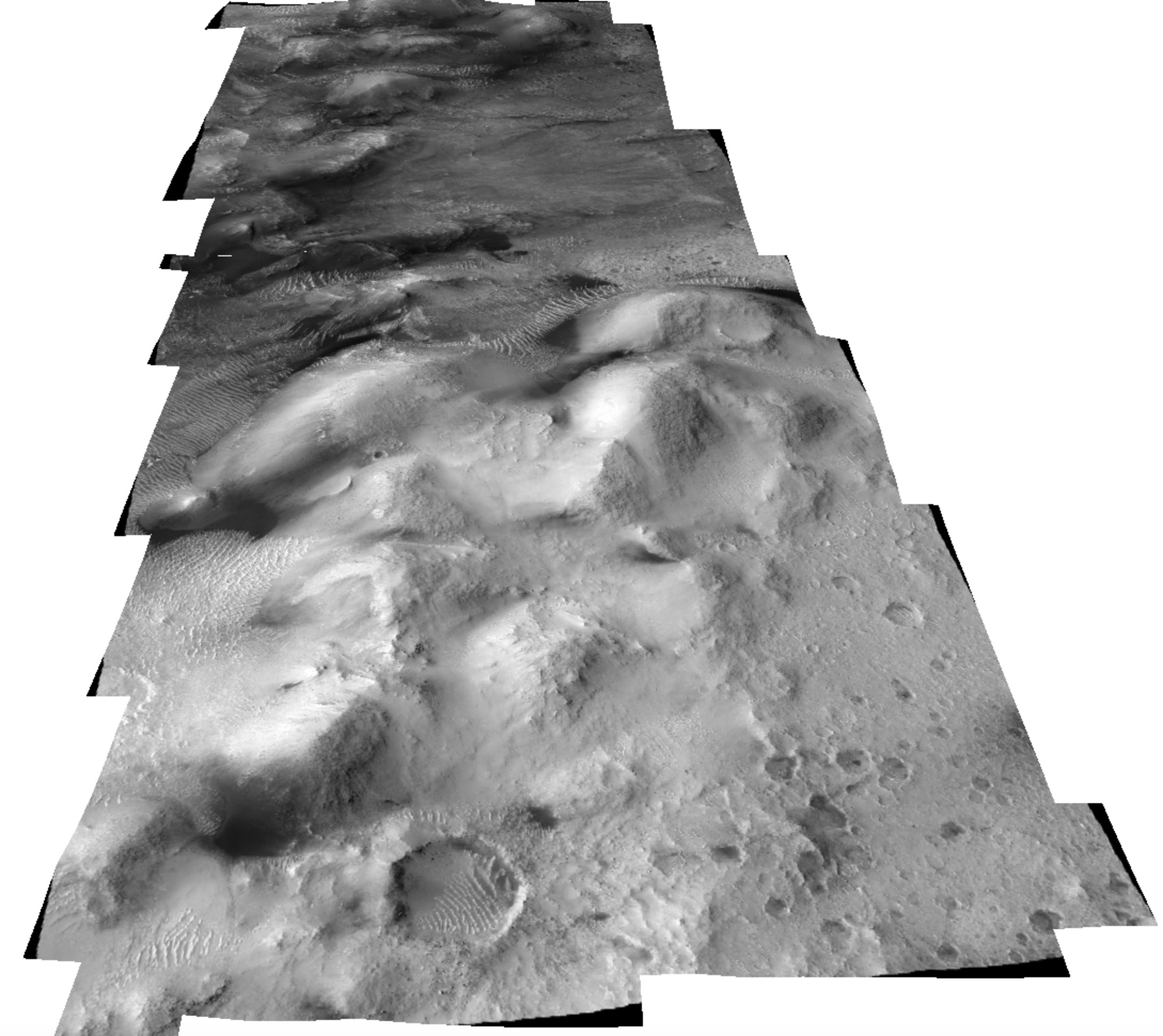 this digital terrain model. This oblique image highlights the hummocky mounds of the plains that border Jezero Crater, which are among the oldest on Mars. Wind has redistributed the dark sand particles and this blowing sand has dislodged much of the surface dust allowing us to see