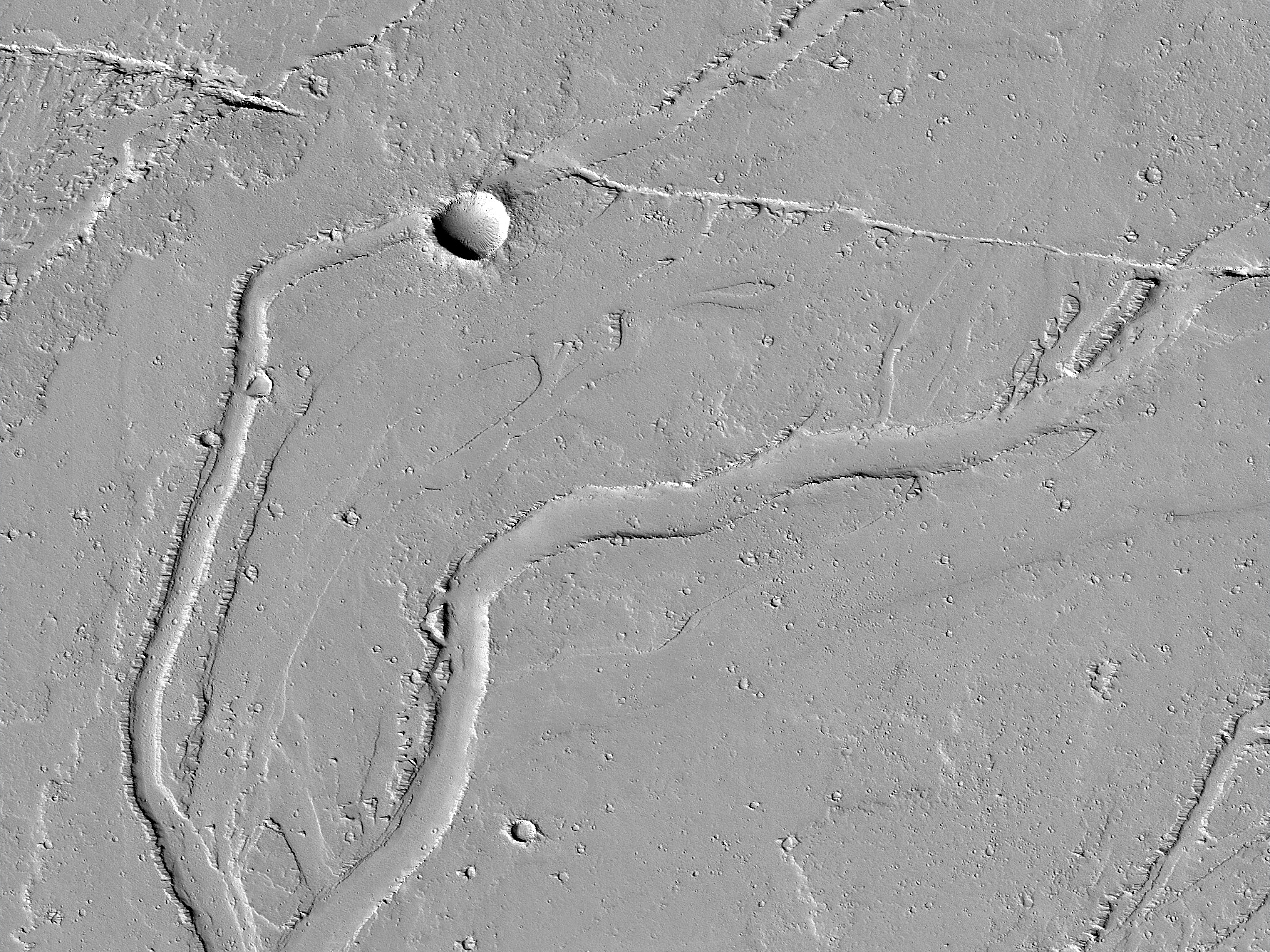 This channel’s shape changes where a narrow fissure crosscuts the floor of a wider channel and adjacent surfaces. The fissure may have released fluid that formed or modified channels downstream to the south. Olympica Fossae is a complex channel located on the volcanic plains between Alba Mons and Olympus Mons.