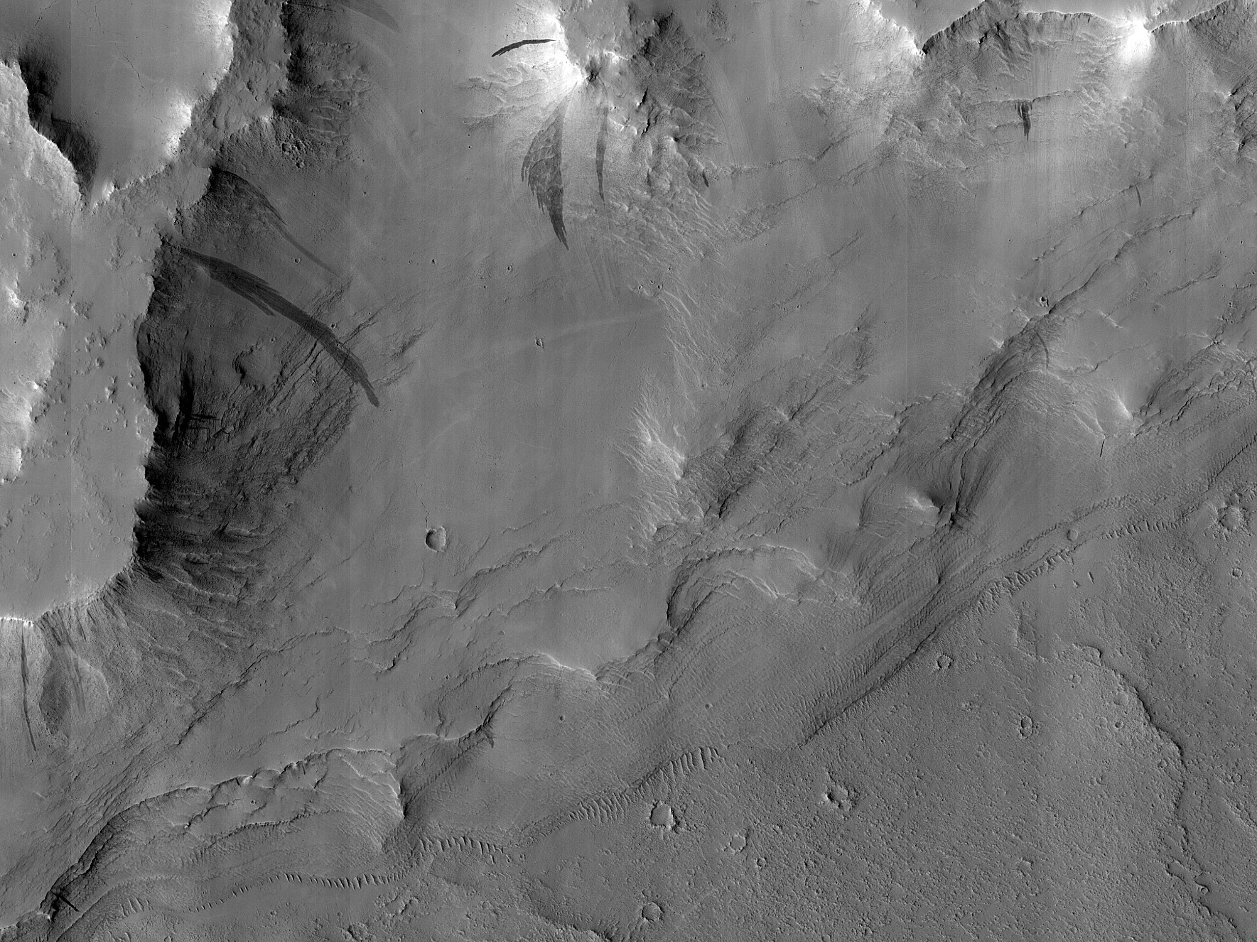 The objective of this observation is to examine layers in the eroded north wall of a crater. All along this wall, there appear to be layers. The layers are next to the crater floor, so they give us an idea of at what depth these formations can be found. It would be interesting to compare these layers with layers found in other places in Arabia Terra.