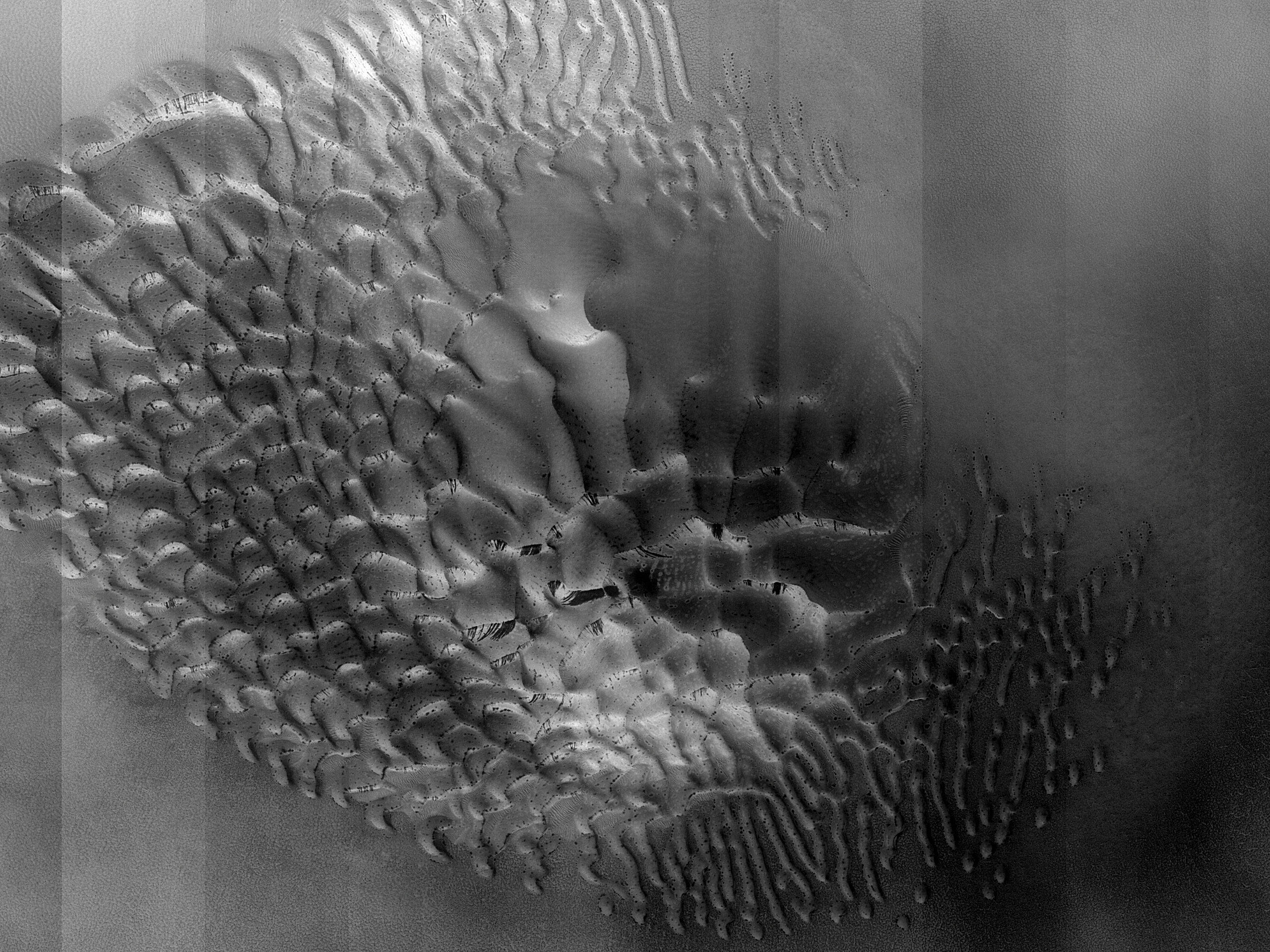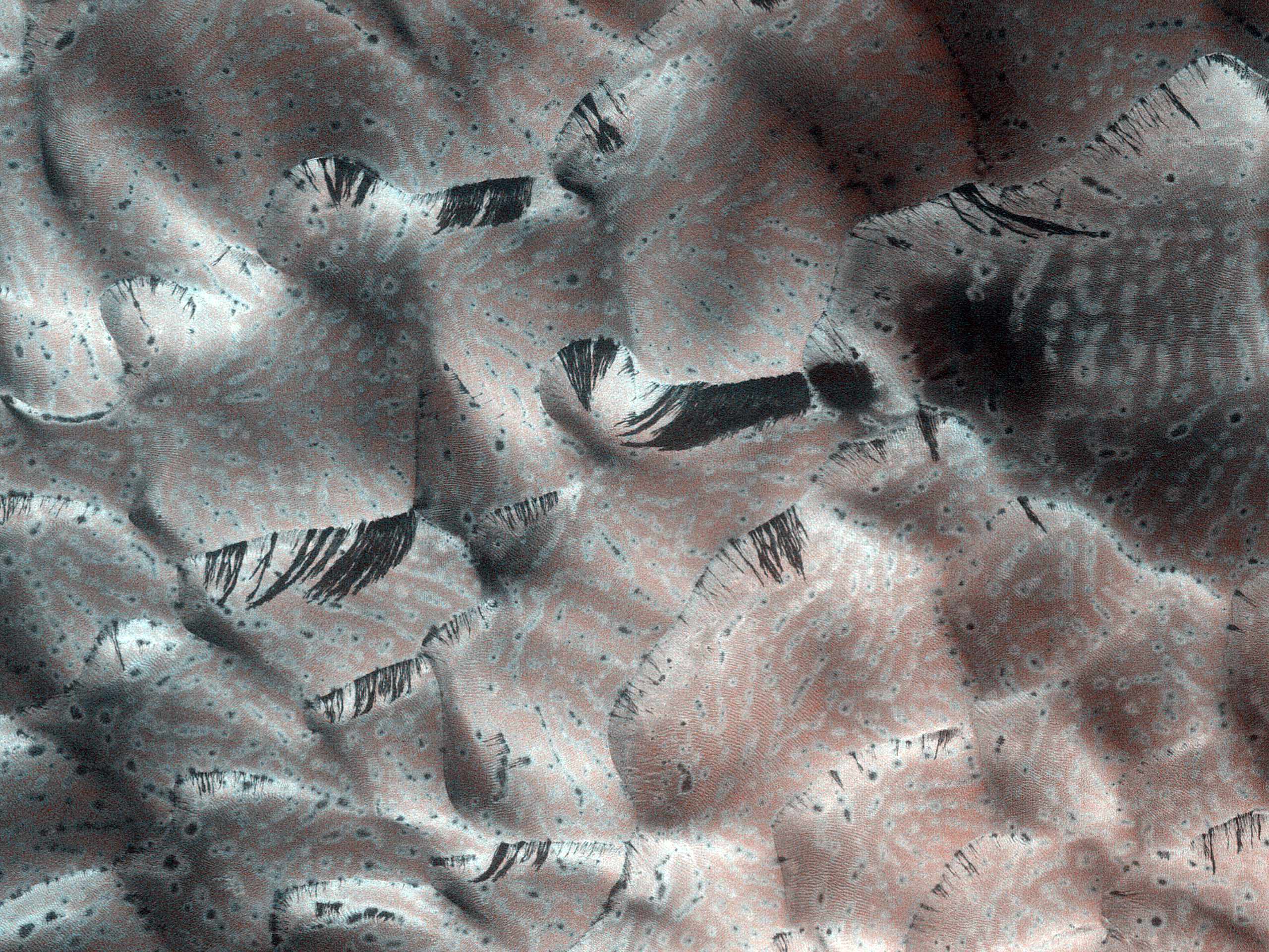The science goal of our observation is checking to see if (1) dune alcoves are forming and (2) if autumn or winter frost is forming that can help to investigate a connection between them. This is part of larger mid-latitude dune field activity study. This field is just south of the central peak we imaged in an earlier observation.
