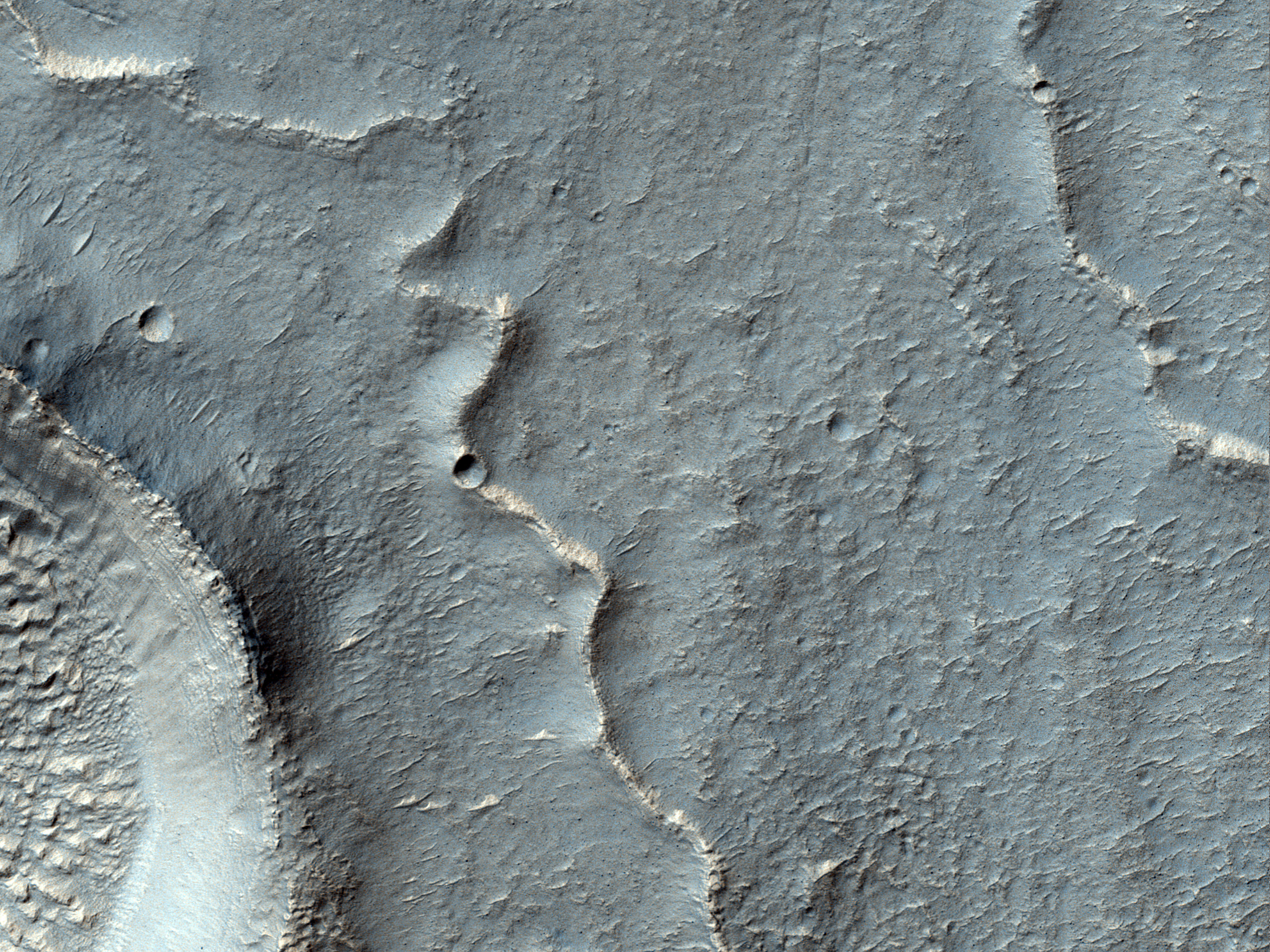 The objective of this observation is to examine curved ridges on the floor of a crater. They may be inverted channels. This scene, also available in Context Camera data, is located within a much larger and unnamed crater to the east of the massive Hellas impact basin. Reull Vallis is a large and morphologically diverse outflow channel system