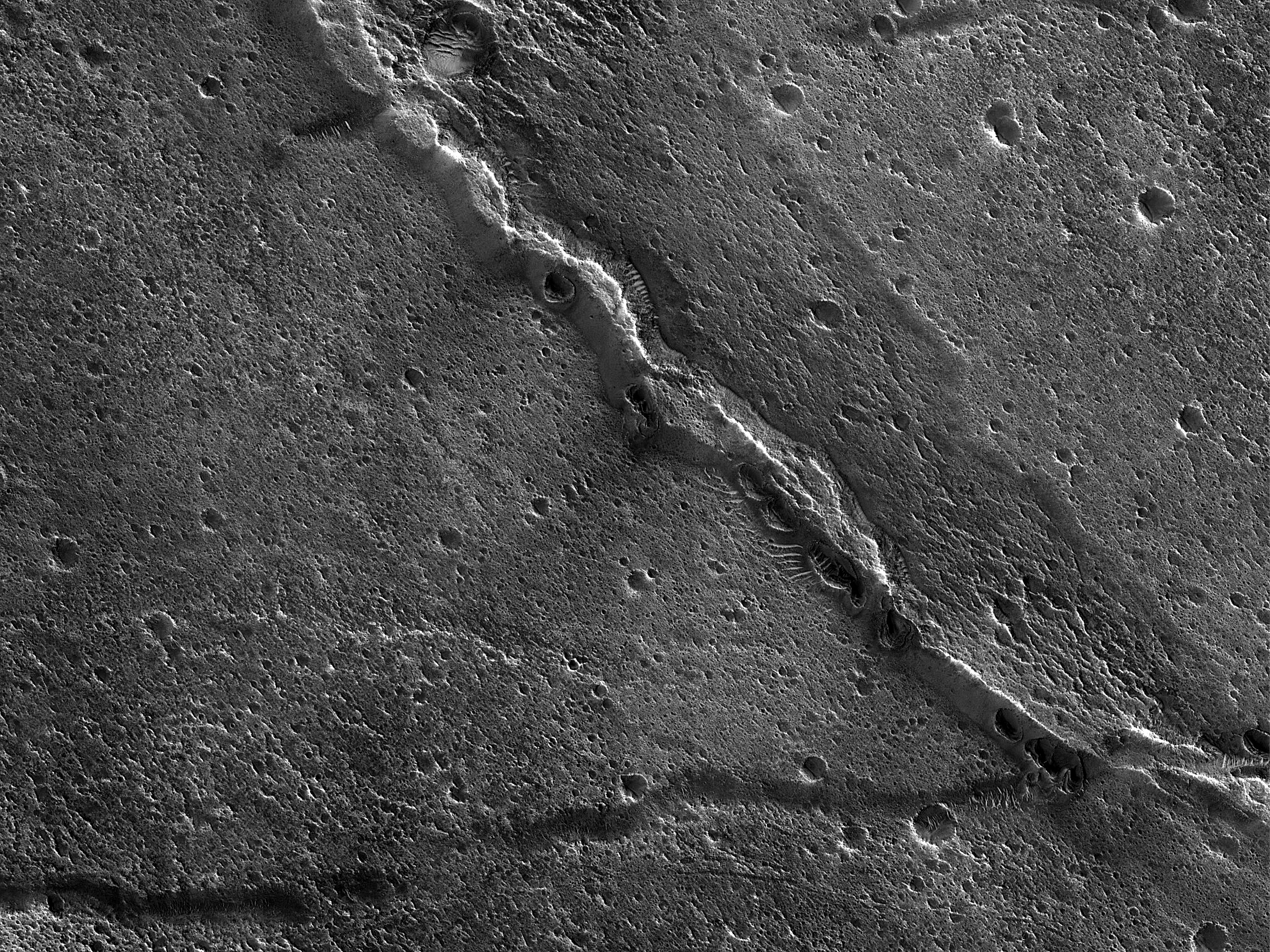 This image presents us with wide troughs with a narrow ridge running down the middle. How did these form? Chryse Planitia is flat lowland region in the Northern Hemisphere of Mars that was chosen for the landing sites of the Viking 1 and Mars Pathfinder craft. The surface rocks of Chryse Planitia are believed to be eroded remnants of basaltic lavas carried to the site by large floods during Mars’ early history.