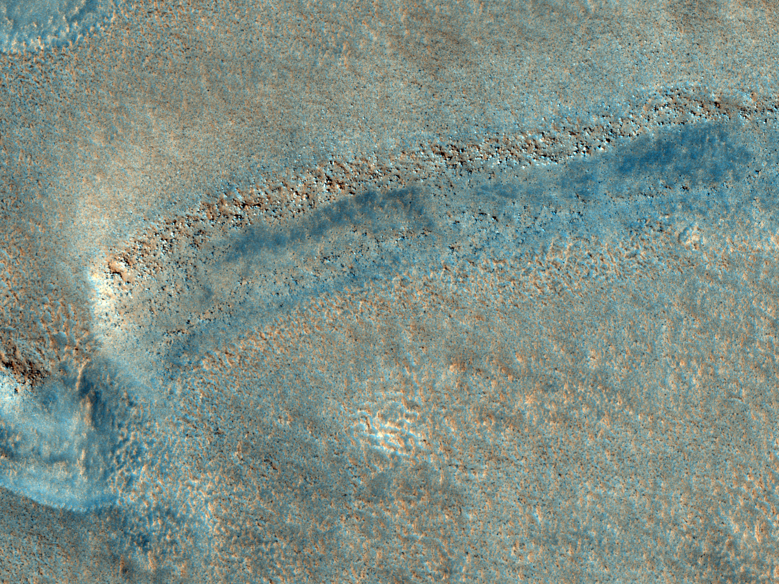 The objective of this observation is to determine the nature of ridges that seem to originate at a crater’s ejecta, the material that settles back down after an impact. They may be inverted channels. Deuteronilus Mensae is located on the northern edge of Arabia Terra and bordering the southern highlands and the northern lowlands, primarily characterised by glacial features.